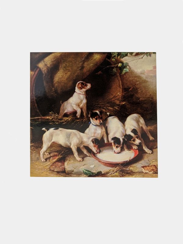 An adorable greetings card with a group of four puppies drinking from a large saucer of milk while a fifth keeps watch. The card has been left blank inside so that you can write your own message, and it comes with a white envelope.