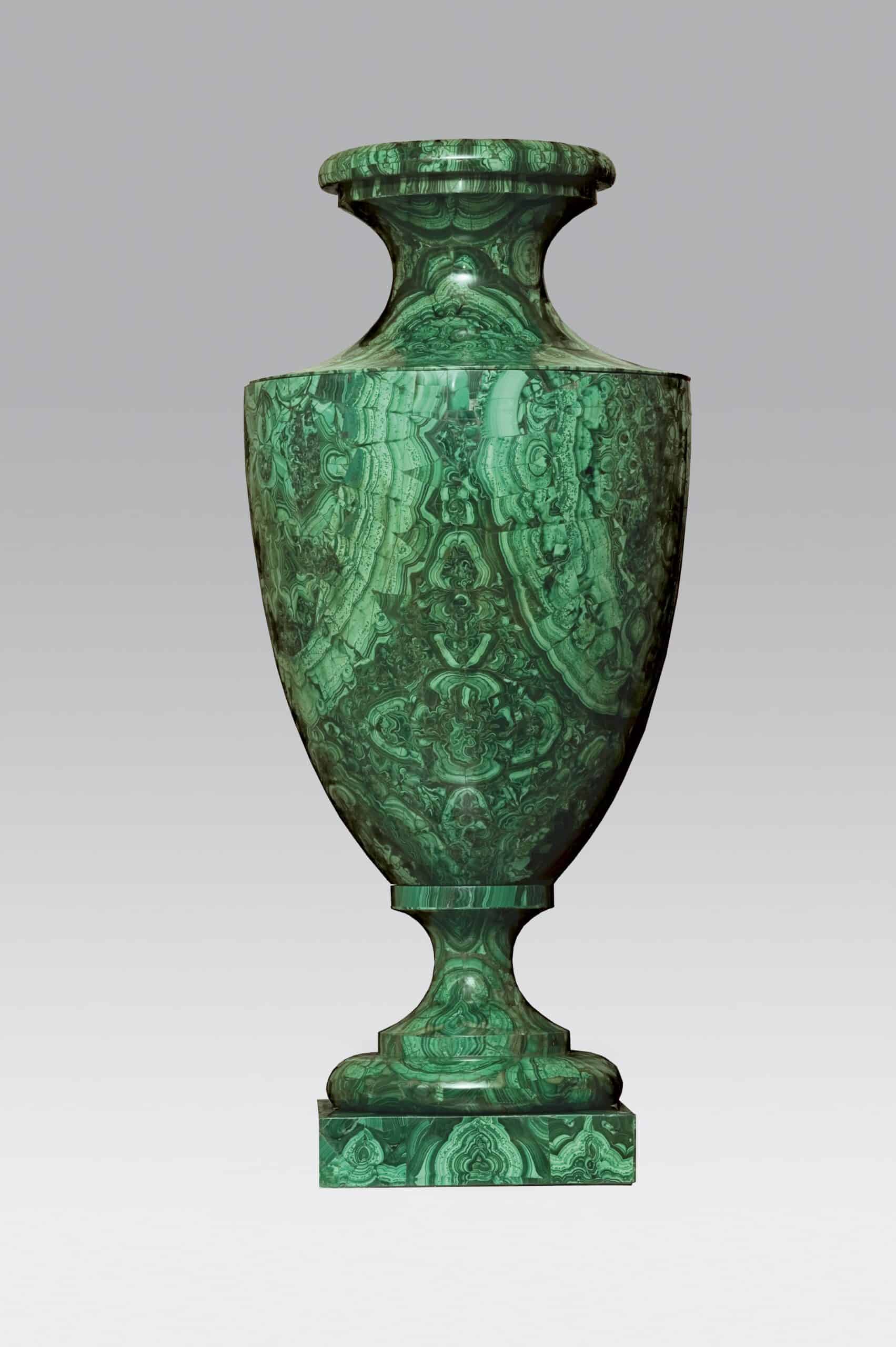 Design inspired by: Attributed to Carl Woerffel Manufactory [from 1880 known as Hoessrich and Woerffel] (Russia, 1842-1914); M.C. Elkin (Russia), lapidary work-master, Malachite vase and cover, c.1860-70, malachite, 97.0 x 43.0 cm diameter.